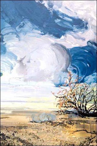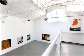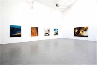 Ça brûle chez Ghislaine Hussenot. Les peintures tout feu tout flamme de Kirsten Everberg propagent un incendie dont la combustion se fige sous un glacis protecteur, presque humide. Mais sous le vernis, la pâte malaxe un feu qui ronge les toiles. Sous un ciel charnel un peu comme chez Boudin, le paysage part en fumée. C’est une tour blanchâtre et brou de noix qui monte vers un horizon livide; un feu de joie pictural où les arbres calcinés se fondent dans le jaune des flammes; des brandons rougeoyants qui crépitent aux pieds de forêts encore indemnes.