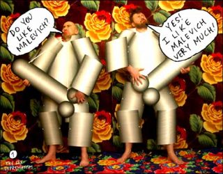 Il en va ainsi de la moquerie potache et licencieuse des dirigeants politiques — Bush et Poutine en compagnie cocasse de Ben Laden pour la série «Contemporary Siberian Artists» (2002) —, des figures héroïques de l’art russe — Rodchenko, Malevitch et Tatline réunis dans l’œuvre «Sex-Suprematism» (2004) —, ou des pratiques de la performance radicale, comme au sein des vidéos du groupe pour lesquelles ses membres se mettent en scène dans des actions grotesques.