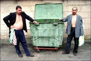 Aux côtés du groupe Blue Noses, se distinguent dans cette voie les collectifs AES et Radek ; le travail, déjà bien connu en France, d’Oleg Kulik ; les performances de Wladislaw Mamyschew-Monroe, où il interprète des personnages tels qu’Hitler, Lénine ou Ben Laden ; ou encore, les photographies de l’ukrainien Boris Mikhailov, dont on peut notamment voir à deux pas la série controversée «If I were a German» (1994), présentée par la galerie Suzanne Tarasiève dans un espace supplémentaire rue Louise-Weiss.