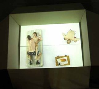 A proximité de cette projection, deux hautes boîtes en carton équipées de moniteurs de la série «The little men», exposée cette année à la Biennale de Venise, confrontent le spectateur à son voyeurisme par une satire obscène de la télé-réalité, qui lui promet : «every thing you always wanted to see on tv but were afraid to ask». Sous les traits de l’ironie et du cynisme, la philosophie des Blue Noses participe donc de ce tropisme de l’idiotie si prégnant dans l’art actuel, auquel Jean-Yves Jouannais a par exemple consacré un ouvrage en 2003 (L’idiotie : Art, vie, politique-méthode). Tropisme, dont les causes sont assurément à rechercher, dans le contexte spécifique de la Russie, du côté de la déréglementation de la société post-soviétique, de l’éclatement des anciennes injonctions formelles du Réalisme socialiste, et du raidissement du climat politique du pays, symbolisé par le Président Poutine et la guerre en Tchétchènie.