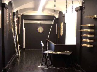 La galerie est plongée dans de semi ténèbres. Comme la vitrine, les cimaises sont couvertes de peinture noire et hormis les rayons prismatiques dispensés par le vitrail, les seules sources d’éclairages sont artificielles : néon diffusant une lumière blanche, ampoules jaunes et écran de télévision. Le visiteur est dans ce qui ressemble à une crypte, une reproduction en miniature et en négatif de l’église voisine. Il ne s’agit pas de singer gratuitement, mais d’inscrire le projet dans un contexte urbain spécifique, de construire des connexions visibles et invisibles avec l’environnement et son histoire.