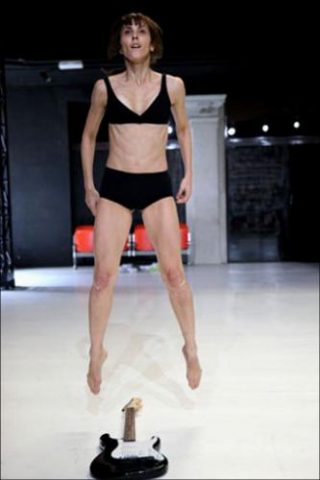Sur scène, les lumières restent allumées, encore plus vives de leur réfléchissement sur le sol blanc. Au centre, un monumental ampli Marshall contraste avec la clarté dominante, masse sombre et phallique, puissance vibratoire en dormance. Un ordinateur portable, un sac de sport et une guitare électrique parachèvent l’environnement créatif de la danseuse. Cette dernière construira avec chacun de ces objets une relation personnelle et insolite, les détournant de leur usage. Si anecdotiques soient-ils, ces échanges disent comment un corps, rendu plastique par la danse classique et le yoga, peut reconfigurer un espace et définir un nouveau rapport entre animé à inanimé.