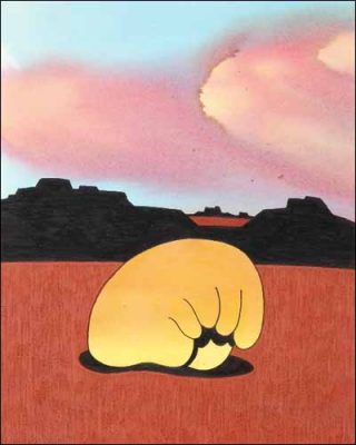 La naïveté apparente qui se dégage de ces images laisse progressivement place à l’inquiétude lorsque on en perçoit le caractère futuriste post-apocalyptique. Car Ken Price ne représente pas les paysages, il les invente. Sculpteur, il crée, lorsqu’il peint, des formes abstraites qu’il conçoit de toutes pièces. Il compose ainsi, à partir d’éléments réels, familiers ou mythiques de l’environnement américain, des paysages simples et vifs qui renvoient à la nature, au mode de vie de son pays, et à un futur imaginé.