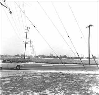 Le ciel, parfois quadrillé de poteaux et de fils électriques, toujours très présent, est traité comme l’espace urbain, c’est-à -dire comme une matière à part entière. La ligne d’horizon, si importante dans les images de Ruscha, équilibre la relation entre le ciel et le paysage.