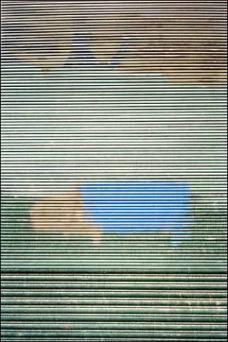 Ville ancienne à taille humaine, Cahors est mise en parallèle avec Los Angeles, métropole récente, complexe, tentaculaire, lointaine et insaisissable, réduite ici à une simple Green Door. Image banale, de grand format, présentée comme un tableau, elle se compose d’un store métallique peint en vert, ponctué de tâches de couleur qui lui donnent l’apparence d’une carte, peut-être celle d’une ville.
