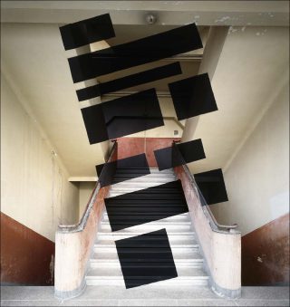 Chambéry, la photographie de Georges Rousse, représente, quant à elle, une architecture qui porte un motif de forme géométrique. Le processus de création de Georges Rousse se décompose en deux temps : il peint un espace architectural de façon à créer une anamorphose : des formes qui, vues depuis un point défini et selon un angle bien précis, dévoilent une image géométrique. En photographiant cette image, Georges Rousse fait apparaître et pérennise un espace qui n’existe pas dans la réalité. L’œuvre fixe un point de vue fugace comme un fantôme, une apparition qui s’efface aussitôt.