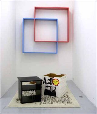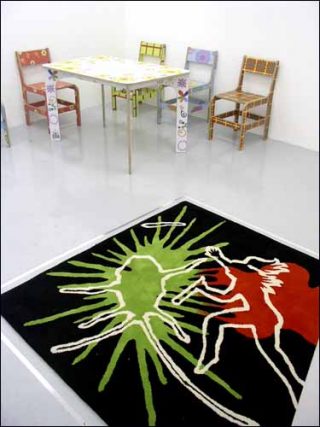 Le duo Mrzyk et Moriceau propose un judicieux tapis de salon (Sans titre, 2004) : on y retrouve leur graphisme acéré, au service d’une composition en noir et blanc rehaussée de rouge sang et de vert. La représentation : deux corps écrasés baignant dans la couleur et l’astucieuse idée d’un questionnement sur la surface versus la profondeur.