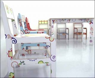 Van der Stokker et Leo Kroll installent une table et des chaises en reprenant le décor fleuri et les couleurs franches acidulées qui font leur marque (Vijfzinnen, Table and Chairs, 2004).