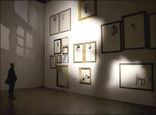 Antichambre de la mort, elle expose des aquarelles dans une série de cadres sur le mur qui nous fait face. Un projecteur met en relief de manière crue et angoissante les morceaux de corps peints. L’espace de chaque support n’est qu’en partie habité par l’image. Le vide tout autour prend tout son sens. Il entre en écho avec la pièce. Plus que toutes les oeuvres accrochées, c’est le sentiment de cruauté et l’effroi qui s’exposent. Palpable, incarné, tactile, le malaise se fait sentir et nous pousse à sortir. Nous sommes mis en situation.