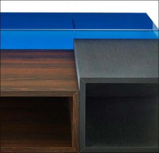 A utiliser dissociés ou combinés, les «U» peuvent être positionnés dos à dos ou alignés, à la guise de leur propriétaire. Chaque «U» offre en outre un double plateau de rangement, chaque plateau supérieur étant décliné à une hauteur distincte. Le bout de canapé associe quant à lui deux «U» de formats différents, inversés pour s’emboîter l’un dans l’autre: on obtient ainsi une petite table d’appoint en verre bleu, tandis que le fond du deuxième «U» en placage aspect chêne fumé sert de réceptacle porte-revues.