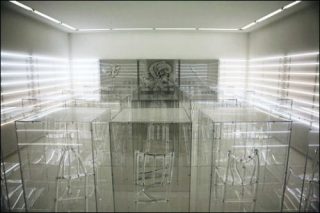 Dans cette salle, chacune des chaises en plexiglas transparent diffère de ses voisines par une déformation qui lui est propre (à l’exception de l’une d’entre elles, droite, modèle du bon élève — ici, Joseph Kosuth par exemple —, mais peut-être aussi forme archétypale de l’Idée qui attend l’élève à la sortie de la caverne platonicienne lorsque, justement, trop d’évidence éblouit).