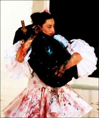 C’est le franchissement de cette limite ténue entre le tendre et l’obscène qui est ainsi à l’œuvre dans la vidéo de l’artiste espagnole Pilar AlbarracÃn, La Cabra, où l’artiste danse avec une outre de vin en peau de chèvre qui colore peu à peu son costume folklorique d’un rouge sang.