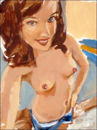 De part et d’autre de la galerie, dialoguent également les peintures pornographiques ou érotiques de Celia Hempton et de Walter Robinson inspirées directement d’images glanées sur des live chats (chat-roulette par exemple) pour la première et sur des sites de photographies ou de streaming pour le second. Certains diront sans doute que ces peintures (surtout celles de Walter Robinson) dans leur facture et dans le choix de leur sujet flirtent assurément avec le mauvais goût mais c’est davantage la contradiction qui les anime qui prévaut ici. Elles attirent en tant que représentations picturales tout en jouant de la banalité de ces images qui circulent en masse, qui sont conçues sans intériorité ni profondeur et sur lesquelles il n’est a priori pas nécessaire de s’attarder puisque dans la logique de défilement continu qui est la leur l’expérience visuelle est épuisée avant même que le visiteur ne soit prêt à les regarder.