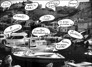 La première est composée de seize photographies ayant pour sujet la ville de Marseille. Mais, loin de se contenter de faire des photos de paysages, Joachim Mogarra introduit des petits personnages dans les images: il parasite les rues et les monuments de petits bonshommes maladroitement dessinés, comme si un enfant s’était emparé de l’album de photos familial.