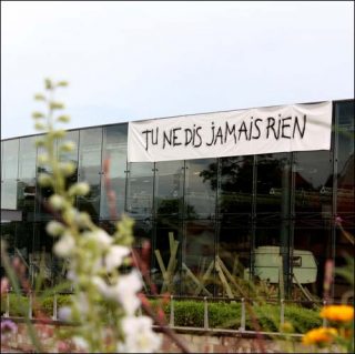 Une grande banderole blanche accrochée sur la façade du bâtiment de verre du Frac Alsace. En ces temps de crise, on pense d’abord à une usine en grève, à l’une des nombreuses actions revendicatives. Mais la phrase inscrite sur banderole, Tu ne dis jamais rien, semble davantage relever du message personnel que du discours public. L’énoncé à la deuxième personne du singulier s’adresse directement à chaque lecteur.