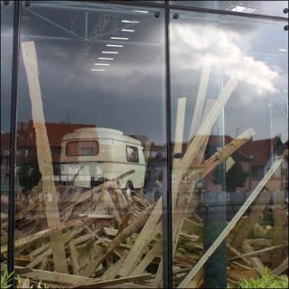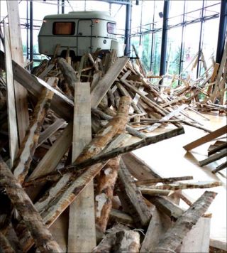 A l’intérieur du bâtiment, Pierre Ardouvin a dressé une série des petits tas faits de chutes de bois brut, ainsi qu’une petite caravane plantée sur l’un des tas de bois. Grâce à la structure en verre du bâtiment, et à la transparence de la façade, l’installation est visible de l’extérieur. Elle ressemble à un paysage dévasté et déserté, comme après une tempête.