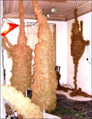 Les sculptures végétales de Franck, semblables à de gros cocons de différentes dimensions, paraissent comme sorties d’un film de science-fiction! Ces sculptures-cocons sont faites d’herbes sèches, les plus grandes contiennent des bocaux où nagent plantes, faux foetus baignés d’une lumière verte translucide, tout cela donnant une impression de laboratoire des horreurs.