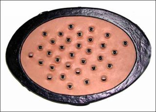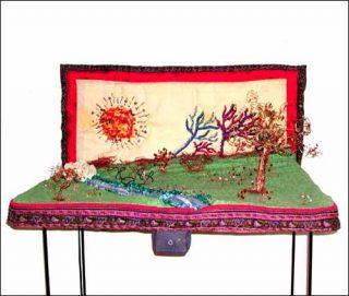 Pascale Bédague expose, posé sur des tréteaux, un vieil abreuvoir ovale en fer rouillé de teinte marron-rouge. L’artiste l’a transformé en berceau et rempli de coton, de plumes et d’herbes folles où se cachent de petits personnages. La froideur morbide du fer s’oppose à la vie et aux matériaux d’apparence douce et légère, à ce jardin poétique et fragile. Précieux, extrêmement délicat, sorte de paysage onirique, le travail de Gaëlle est fait de tissus brodés de perles et de paillettes. L’agilité de l’artiste façonne un univers enfantin et magique.