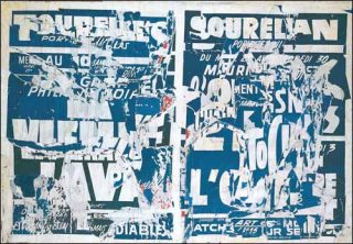Les affiches ne présentent pratiquement aucune image, aucune forme humaine, comme il peut y en avoir dans d’autres affiches de Jacques Villeglé ou dans un traitement beaucoup plus «pop» de la technique chez Mimmo Rotella par exemple. Ici, les affiches sont plus austères et moins séduisantes, elles ne sont que bribes de couleurs (principalement des bleus et des rouges) et bribes de lettres, avant même d’être des bribes de mots.