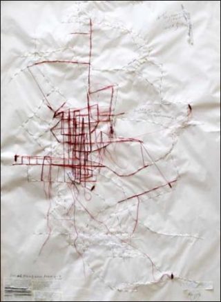 Dans sa série «La Langue Secouée», Myriam Mihindou questionne la langue française, dont les mots n’ont pas nécessairement le même sens à Libreville, à Paris ou au Maroc, où elle vit aujourd’hui. «Feuilles découpées, percées, froissées, tressées, nouées: le lexique se brouille, les définitions s’effilochent, littéralement. » (Philippe Dagen, Le Monde 8/11/2009)