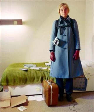La série Suite française est une mise en scène au déroulement très narratif de son personnage. Ainsi dans le cliché Revenue: elle pose dans une chambre d’hôtel au lit défait, revêtue d’un manteau et de gants, portant un sac à dos, une valise posée à ses côtés, ce qui esquisse un récit.