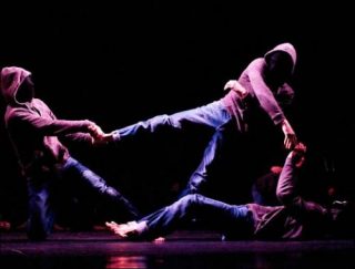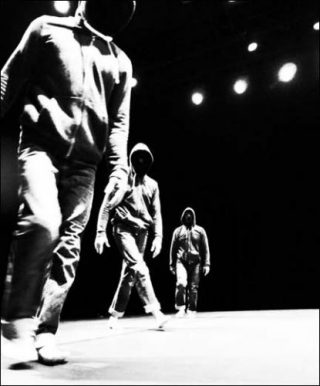 La mécanique des ombres, c’est une histoire dans laquelle nous sommes tous nés le même jour; c’est le retour à un pied d’égalité entre tous les hommes. Le moindre geste est reflexe instinctif. La psychologie est abandonnée et le regard va à l’essentiel. Les trois danseurs encapuchonnés dissimulent leurs figures. Ainsi ils ne représentent pas un homme mais tous les hommes. Sans visages, ils incarnent alors chacun des visages qui constituent le public de la pièce.