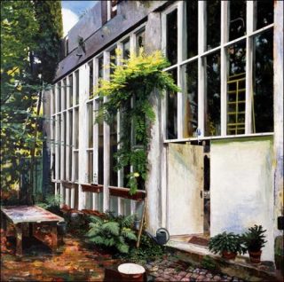 Si dans La Mémé 2 (2013), la composition s’articule autour de l’arbre, l’immeuble se déployant en deuxième plan, la distance diminue davantage dans L’atelier de Marc Pataut à la Maladrerie (2014) où la porte ouverte nous invite à voir l’intérieur. Le tableau fonctionne ainsi comme une fiction. Comme l’artiste le souligne, «par cette fiction, je m’adresse aux habitants. Habitants, spectateurs ou spectateurs-habitants, destinateurs de tableaux, ils en sont les personnages naturels». (Yves Bélorgey, Intérieurs aux Avanchets, été 2013. Texte publié à l’occasion de son exposition au MAMCO.)