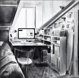 Tous les détails de la composition proviennent du réel que l’artiste enregistre avec son appareil photo avant de les dessiner sur le papier, fusionnant ainsi le vocabulaire de la photographie en noir et blanc avec celui du dessin. Outil de création et langage plastique à la fois, la photographie se trouve ainsi au cœur de son travail.