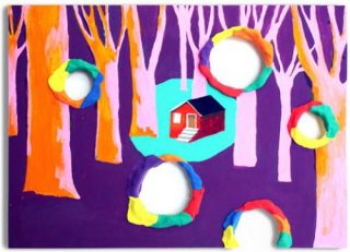 Dans cet univers-là , les images ont abandonné les cadres bien réglés de la géométrie et de la ressemblance. Les œuvres sont trouées — des trous que l’artiste cercle de pâte à modeler aux couleurs vives dans La maison dans les bois: trous de mémoire, trou de l’inconscient, trou de serrure ou trou du terrier du lapin blanc dans lequel tomba Alice. Le trou est une zone d’ombre, un autre indice donné par l’artiste pour affirmer la dimension essentiellement décousue de ces petites narrations qui continuent de résonner comme des ritournelles lorsque le visiteur quitte l’exposition.