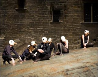 Le spectacle, qui s’ouvre sur la mort de Tréplev, donc sur la fin de la pièce, propose par un effet de montage la même figure de boucle temporelle qui fait ensuite se dérouler le texte de Tchekhov comme un retour en arrière. «Je suis une mouette» dit Arkadina, et tous les personnages font leur apparition vêtus de couleurs sombres, la tête dissimulée dans un masque de mouette, dansant une danse légère et joyeuse avant que ne commence la pièce dans la pièce jouée par Nina.
