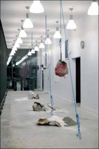 Les oeuvres présentées sont à la fois constitutives du monde qui nous entoure, (par l’utisation des matériaux tirés de notre environnement quotidien: un cendrier, des sacs de ciment…) et pourtant déplacées, tirées d’un contexte à un autre dont la poésie résiderait dans la fuite du sens, la transcendance de l’utile.