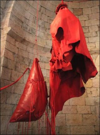 Dans cette installation, le choix du cuir n’est pas anodin. Ce matériau est riche de mille connotations en ce que, travaillé et usiné, il demeure encore et toujours de la peau. L’oeuvre d’Aïcha Hamu assure d’emblée, dans le domaine de la représentation, la tension entre deux attitudes apparemment opposées: celle de la projection imaginaire et celle de l’incarnation.