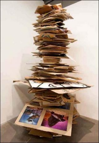 — Jeudi 17.1.1991—Jeudi 28.2.1991, 1991. Carton aggloméré, bois, adhésifs, imprimés, papier. 250 x 100 x 100 cm.