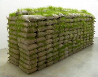 Constituée d’une double rangée de sacs en toile superposés, l’œuvre ressemble aux murets que les militaires érigent dans les villes en guerre pour se protéger des balles ennemies. A ceci près que les sacs de Mona Hatoum ne sont pas remplis de sable, mais de terre et de graines qui, en germant, percent les parois des sacs et couvrent l’œuvre de mille pousses d’herbe verte.