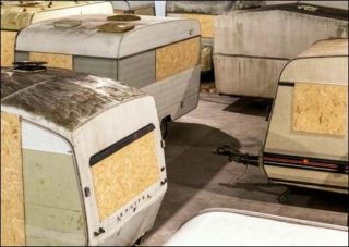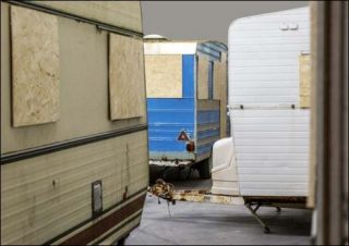 A l’occasion de son exposition personnelle, Héctor Zamora investit la grande salle du Frac des Pays de la Loire en y installant 17 caravanes (autant qu’il était possible d’en mettre) dont les ouvertures ont été obstruées par des planches de bois, formant un campement labyrinthique et oppressant à travers lequel les visiteurs sont invités à se frayer un chemin, avec pour seul horizon la prochaine caravane.