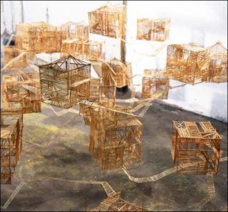 Récemment, l’artiste a initié un travail sculptural à partir de tasseaux de bois empruntés au domaine de la construction. Elle les découpe, sculpte et assemble pour créer des hameaux de cabanes aux dimensions variables, du mobile à l’habitation. «J’anoblis la fonction de «charpente» par des procédés et des gestes simples. L’objet devient hybride, entre structure et ornement, et offre une nouvelle phase de lecture, au-delà du procédé de fabrication.»