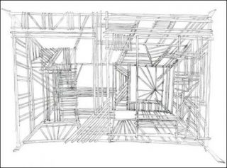 Pour son exposition personnelle au Palais de Tokyo, Sara Favriau déploie 2000 tasseaux d’épicéa brut dans l’espace de la galerie Wilson, sculptés et assemblés en un îlot de cinq cabanes-réceptacles reliées par des passerelles. Ces cabanes sont pourtant impraticables, construites juste en dessous de l’échelle humaine et dessinées en circuit clos, incitant le public à explorer son œuvre par la projection mentale.