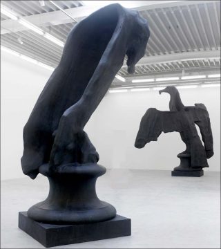 La spiritualité, le pouvoir, la politique, l’écologie et l’histoire sont également des thèmes qui nourrissent l’œuvre de Johan Creten, comme dans la monumentale sculpture en bronze Pliny’s Sorrow. Un oiseau colossal évoque aussi bien l’aigle symbole de pouvoir que l’oiseau englué dans du mazout, posé sur un socle d’inspiration Renaissance. Le titre de l’œuvre fait référence au désespoir de Pline le Jeune, écrivain et politicien romain du premier siècle qui fut le témoin direct de l’éruption du Vésuve. La sculpture est riche d’évocations multiples : le poids de l’histoire, la mémoire, les catastrophes écologiques…
