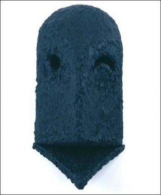 Mais si son Å“uvre voisine avec l’ésotérisme, c’est incontestable, elle est toujours rattrapée par un moment de futilité, par une seconde d’ironie rafraîchissante. A l’image de cette nuit faussement palpable. A l’image surtout de ces masques pseudo-primitifs mal dégrossis, hilares ou bêtas, qui brisent l’élan hiératique de la représentation humaine et lui renvoient une image délibérément négative. L’ironie est d’autant plus complète qu’il s’agit d’autoportrait.