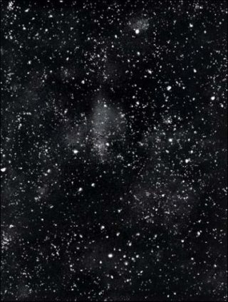Chez Almine Rech, Ugo Rondinone présente une nouvelle série de grands tableaux au sujet invariable, des plages de ciels étoilés. Simplissime trajectoire de la peinture et accord parfait de taches blanches sur d’impassibles fonds noirs.