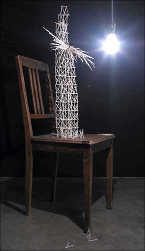 Une autre part du travail d’Anne-Lise Coste se situe dans le domaine de la sculpture, ou plus exactement de la construction. En une minute (2007) est une tour construite à base de bâtonnets de bois, posée sur une chaise faiblement éclairée par une ampoule nue, qui éclaire la tour et lui donne une monumentalité l’associant à une architecture. On peut imaginer que le titre de l’œuvre corresponde au temps qu’il faudrait pour détruire l’œuvre instable, et pèse comme une menace sur cela même qu’il désigne.