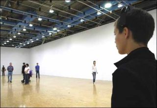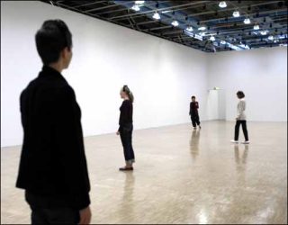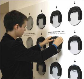 Minimal, ludique, interactif et déceptif, le dispositif mis en place par Jeppe Hein à l’Espace 315 est assurément dans la lignée de ses œuvres précédentes. La proposition est simple, clairement énoncée par des pictogrammes limpides affichés à l’entrée de la galerie. Le Labyrinthe invisible en occupe l’intégralité de l’espace, visiblement vide. Des spectateurs y déambulent, esquissent des pas de danse, le plus souvent sourire aux lèvres, un petit casque vissé sur la tête. Ce sont les vibrations que celui-ci émet qui signalent l’obstacle d’un mur purement virtuel. Tel un cobaye de laboratoire, le spectateur recule, tourne sur lui-même, essayant de trouver son chemin, alors même qu’il est privé de la vue, son sens le plus précieux pour cela, et normalement sollicité par les arts plastiques.