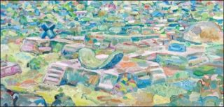 Si la peinture classique semble ignorer l’aléatoire, Ernesto Sartori le réintègre dans sa pratique et en fait la structure de ce monde très humain, aux traits changeants et à l’instabilité évidente. L’artiste applique les colorants et la gouache parfois directement sur les objets et volumes, avec la main ou avec une spatule. Il joue avec ce qui se reproduit (architectures, paysages et sensations colorées) et ce qui ne se reproduit pas à priori (ustensiles, outils, chutes de matériaux), pour nous garder au plus proche de ces arrangements, troublés par cette impression étrange que l’objet a une voix propre comme lorsqu’on les côtoyait, enfant.