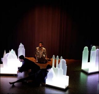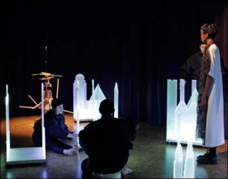 Une figure féminine incarne la fiancée du Robot King, Kayje. Elle évolue dans un périmètre restreint tout comme la marionnette. C’est la ville tout entière qui, en se déplaçant, va donner l’impression que les deux figures se déplacent. Alors que les éléments du Robot King, cinq têtes, cinq bras et cinq jambes, sont reliés ensemble par des bouts de ficelle pour ne former qu’une seule figure, les éléments de la ville sont liés entre eux par les danseurs. Lagune est donc construit comme un dispositif gigogne (ou poupée russe). Au centre, dans un premier cercle, se trouvent le Robot King et sa fiancée humaine. Ceux-ci évoluent à l’intérieur d’un second cercle, la ville. Cette dernière se trouve également contenue dans une troisième figure, plus décousue, celle que forment les cinq éléments du rempart. Complètement démontable, la ville miniature de Denis Savary sera agencée de manière différente dans chaque lieu ou se jouera le spectacle.