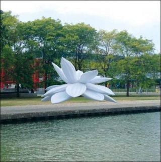 — Choi Jeong Hwa (Corée du Sud), White Lotus, créé en 2015. 8 m de diamètre, 3,5 m de haut. Tissu, souffleur d’air, moteur, minuterie.