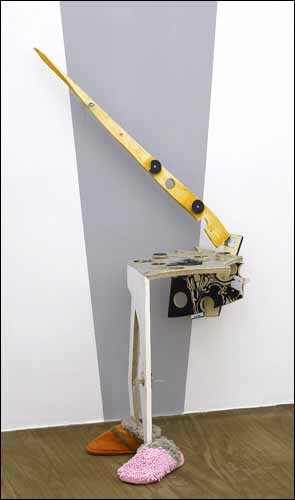 Cet objet banal et familier est détourné de sa fonction première et devient inutile, il devient un pur élément plastique. Toujours sur la même sculpture, des ronds de bois ont été découpés dans la planche horizontale puis vissés ailleurs sur cette même planche. Ils s’agit ici de déplacer les éléments, de leur donner une nouvelle place au sein de l’œuvre d’art.