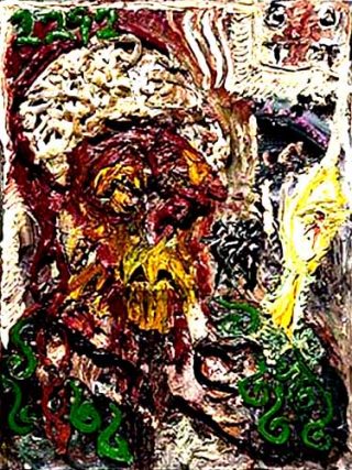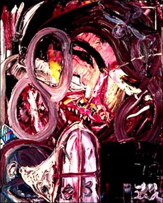 On peut parler d’un faire expressionniste — non d’une touche car la quantité de matière empêche de penser le pinceau — d’une manière non soignée qui frôle avec le barbouillage. C’est un empâtement plein de vagues, souvent de plusieurs centimètres d’épaisseur. Quand on s’éloigne, c’est une figure animale ou humaine ou un peu des deux, toujours un peu noire même si les couleurs sont vives ou claires.