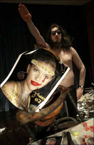 On connaît l’aisance théâtrale et théâtralisante de Jonathan Meese qui se plaît à se mettre en scène dans son éternel survêtement Adidas noir aux trois lignes blanches, qui se joue de l’art de la performance en créant des coups d’éclat, en détournant le procédé désormais institutionnel sous forme politique et contestataire.