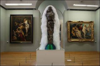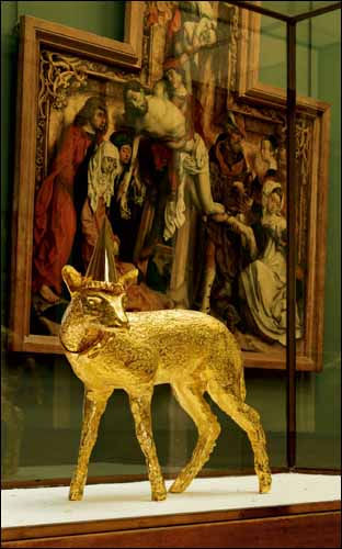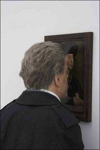 A l’entrée de l’immense collection, une installation déconcertante brise le tabou de la distance conventionnelle, qu’est tenu de respecter le spectateur face à l’œuvre : un petit homme vêtu d’un pardessus se casse littéralement le nez sur un tableau d’un de ses lointains prédécesseurs, Rogier Van der Weyden, et se vide lentement de son sang.