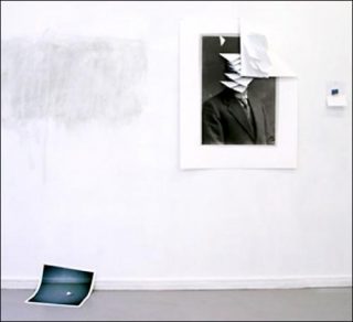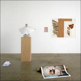 Produisant ainsi l’ébauche d’un vocabulaire matérialisé, sensuel et viril, ces mises en tension, qui passent par le travail des médiums et de leurs limites, entre objectivation incarnée et sensualité paramétrée, est subjective et précaire, ainsi que le suggère un fragile assemblage de rouleaux de papier, qui fait s’étirer de la mezzanine au foyer une langue rose, retenue au sol par d’autres rouleaux, une chaise, une photo de chaise, un texte, qui évoque le devenir détritus de toute chose, perlés de gouttes du même rose que la langue de papier. Une citation déstructurée de la fameuse Å“uvre conceptuelle de Kosuth, qui interroge le rapport du langage et de l’image, en ouvrant une multitude de lignes de fuite.